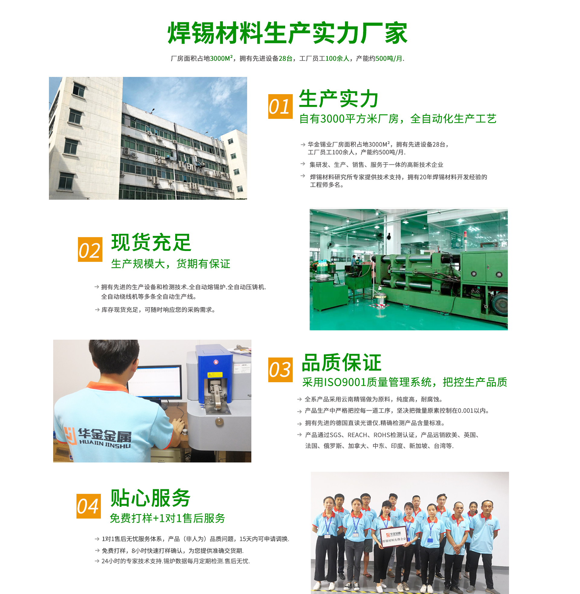 華金錫業有限公司一家資深的專業焊錫制品生產廠家,多年專注焊錫制品生產加工。產品有無鉛錫絲.無鉛錫條.錫板.錫膏.錫珠等.公司憑借多年的經驗和不斷的科技創新.生產的產品各項技術性能均達到國家標準.歐盟標準。并獲得眾多使用廠家的肯定.為適應環保要求.本公司2003年巨資投入生產無鉛焊錫,多年來連續通過SGS環保認證.產品規格齊全,使用性能極佳??蛻羧后w遍布全國各地及國外用戶。華金錫業焊錫制品是選用一線品牌作為原材料,采用選進的配方,精工制作各種規格不同的型號,再采用全自動流水線作業擠拉成各種符合要求的焊錫絲和焊錫條。華金牌焊錫制品以其一流的品質,真誠的服務,產品銷往全國各地,深受廣大用戶的高度贊揚。
